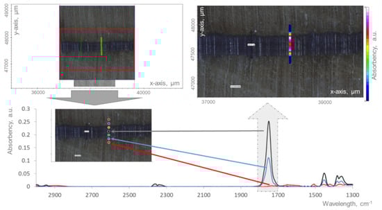 A comprehensive analysis of the adhesion interface developed across PLA-laminate bondlines was undertaken using FTIR microscopy. This analysis evaluated both the inner, core and outer, surface PLA bondlines of the 5-ply laminate panel sets. Building on a chemical spatial imaging methodology initially used for polyester bonding of hardwood [], the polyester carbonyl group (νC=O, ca. 1750 cm−1) of PLA was used to evaluate the distribution of PLA across the PLA–wood adhesion interface (Figure 2). This included metrics for the PLA bondline thickness and the extent of the PLA interphase developed within the wood matrix. Shown in Figure 2 is the chemical spatial imaging of a typical PLA bondline produced in this study. Evident in this image are FTIR point spectra and a PLA concentration contour plot (1750 cm−1 peak) across the imaged PLA bondline section. From this chemical spatial imaging, the thickness of each PLA bondline can be readily determined from both the light microscopy image as well as the PLA concentration profile evident from the PLA ester peak contour plot. Similarly, using these contour plots, the extent of PLA ingress or penetration into the wood veneer can be calculated to define the extent the PLA migration away from the bondline into the wood ultrastructure during pressing [].