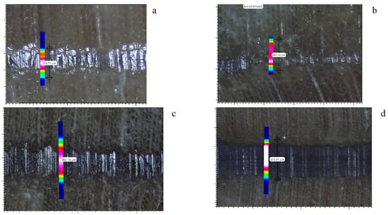 Employing the OPUS 8 software (Bruker, Germany), the distinctive PLA carbonyl peak (1750 cm−1) was used to develop contour plots from the FTIR point spectra []. These plots were projected onto the imaged cross-sections to guide the subsequent user-defined measurements of the PLA bondline thickness and PLA migration. The average penetration values were calculated from these bondline thickness and migration measurements (Equation (1)):