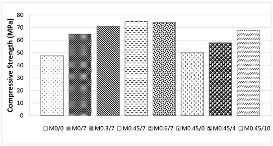 The growing demand for high-strength concrete (HSC) has led to a significant increase in cement consumption, causing serious environmental issues [1]. In contrast, the use of high-strength concrete ultimately leads to an increase in the cost of construction as a result of the need to use specific materials and additives to increase the strength, as well as specialized curing methods [2,3]. Therefore, different research has been focused on realizing the manufacture of high-strength concrete (HSC) at the lowest possible cost [4].