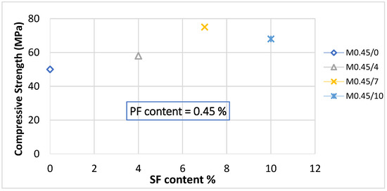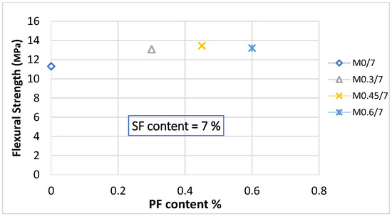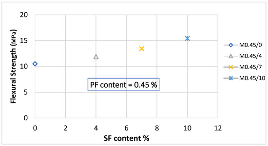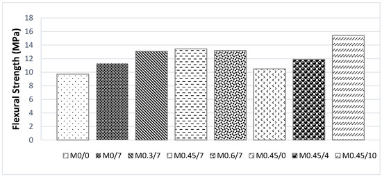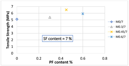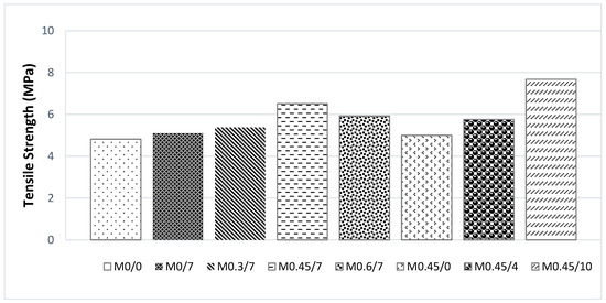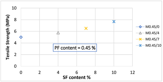 The presence of hybrid steel-polypropylene fibers improved the flexural strength of fiber-reinforced concrete specimens more than the inclusion of only one type of fiber. As previously stated, this is due to the hybrid fiber’s ability to prevent the opening and expansion of micro and macro cracks at various stress levels, as polypropylene fibers with a low modulus of elasticity greatly improve concrete flexural behavior by limiting the formation of microcracks at low-stress levels, and steel fibers with a high modulus of elasticity incorporated in cementitious materials improve flexural behavior by preventing the growth of microcracks. The largest flexural strength was observed for specimen M0.45/10, which contains a steel fiber content of 10% and a polypropylene fiber content of 0.45%. The same was true with tensile strength, as increasing the polypropylene fiber concentration above 0.45% reduced the flexural strength of the concrete specimens. Figure 14 and Figure 15 illustrate the effect of steel fiber content and polypropylene fiber content on tensile strength, respectively. These findings will help advance future applications [46,47,48,49,50,51,52,53,54,55,56].