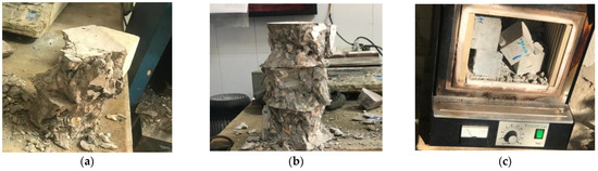 Concrete specimens were tested for compression once the furnace had dropped to normal temperature. The process of thermal deterioration in concrete starts from the heating process and continues until the temperature reaches ambient level. Thermal cracking due to mechanical actions and hydration decomposition occurs during this process. The thermal cracks increase as the heating level rises, and the progressive increase in pore pressure more rapidly meets or exceeds the strength, eventually breaking up the concrete. This explains why the control specimens, which were devoid of fibers, would be unable to tolerate temperatures beyond 200 °C, where an explosive thermal spalling occurred suddenly during the heating process as shown in Figure 6c. Concrete specimens containing individual or hybrid fibers, on the other hand, did not experience explosive thermal spalling during the heating process and could withstand temperatures up to 600 °C. This reflects the effect of fibers in enhancing the hydration process and subsequently delaying the cracking process and improving the bonding strength between the aggregates and the surrounded paste.