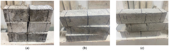 The flexural failure modes for the tested concrete specimens exposed to room temperature are shown in Figure 8. Vertical micro-cracks first appeared in the location of maximum tensile stress, which is the mid-span for beam specimens. As the loading increased, these cracks began to extend vertically and expand until the failure occurred. The failure pattern for control specimens was a brittle failure with total splitting into two halves due to a wide vertical crack at the mid-span, as shown in Figure 8a. Specimens with individual fibers or hybrid fibers had failed when the tensile stress exceeded the bonding stress between fibers and the composite (bonding failure) without full splitting at the critical zone, as shown in Figure 8a,b. This indicates that fiber-reinforced concrete specimens behaved similarly under both the splitting tensile and bending tests.