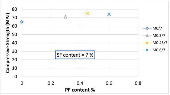 Adding fibers to the concrete mix improves the strength and the behavior of concrete by delaying the initiation of cracks and controlling its propagation [5,6,7,8]. The commonly used fibers in the concrete mixture are mainly steel fibers (SF), carbon fibers (CF), and polymer fibers (PF). Steel fiber is considered the most popular, as it can effectively increase the tensile and compressive strength of the hardened concrete more than other types of fibers [9]. Despite this, the use of polypropylene fiber has proven its efficiency in improving the mechanical properties of hardened concrete and its use in many applications [10,11,12,13,14]. Polypropylene fiber has attracted the interest of many researchers due to its low cost and high resistance to shrinking and roughness [14,15]. Several earlier investigations on the addition of polypropylene fiber to concrete mixtures revealed that the type and content of fibers has a substantial impact on the mechanical properties of concrete [10,11,16].