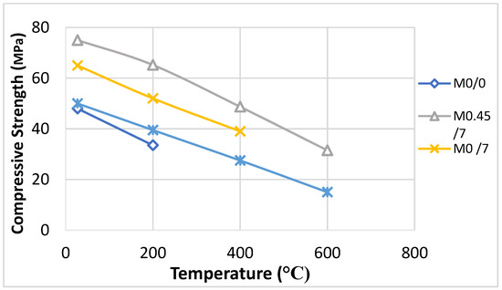 3.1.2. Compressive Strength for Specimens Exposed to High Temperatures