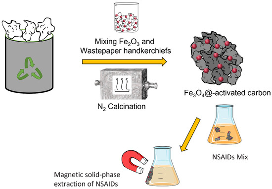 In this study, we propose a new adsorbent based on iron oxide and obtained by using low-cost, abundant wastepaper handkerchiefs through a simple carbothermal reduction method. The wastepaper handkerchiefs were used as a carbon source to generate Fe3O4 in situ, giving a residual porous carbon which has high adsorption capacity. The samples were investigated via SEM–EDX, XRD, thermogravimetric analysis, and Raman spectroscopy to ascertain the effect of the relative proportion of iron and carbon on the stability, structure, and morphology. Finally, the prepared “Fe3O4@-activated carbon” samples were used for the MSPE of some NSAIDs contained in human plasma. The potential of this approach relies on the possible production of a large number of adsorbents, with proven separation capacity starting from waste—wastepaper as in this case—but also scrap iron waste by opportunely modifying the procedure, promoting a complete utilisation of resources for a more sustainable future.