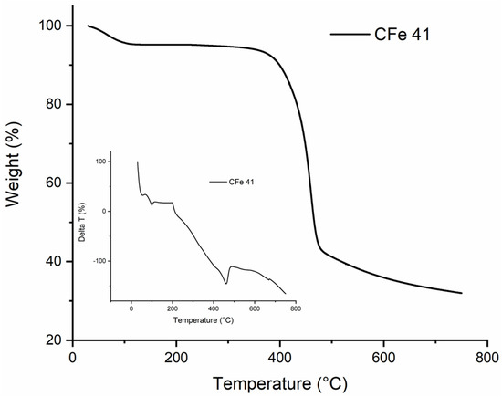 Prior to the thermal treatment, thermal analysis was carried out to optimise the calcination conditions. The thermogram obtained for the CFe41 sample with the respective DTA curve is shown as an example (Figure 2).