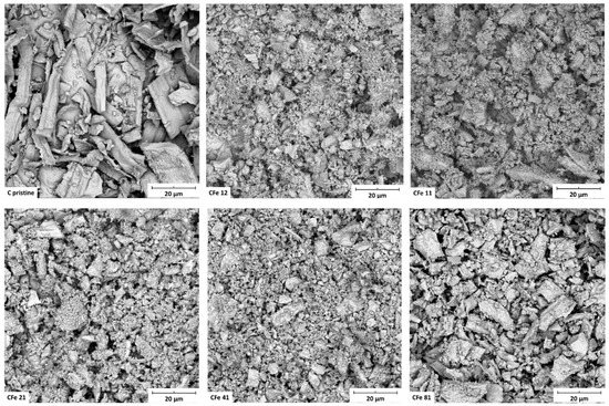 SEM images of C pristine, CFe12, CFe11, CFe21, CFe41, and CFe81 after grinding in the planetary miller.