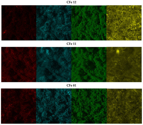 EDX images of CFe12, CFe11, and CFe81. Colour code: carbon in red, oxygen in blue, nitrogen in green, and iron in yellow.