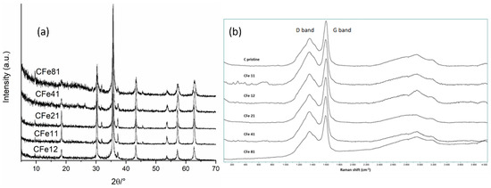 XRD patterns (Figure 5a) were acquired in order to identify the phases in the samples. The diffraction peaks matched very well with the reported data of magnetite (JCPDS No. 19-0629), thus confirming that the synthesis was effective in producing the target phase. When the paper:iron ratio was high, resulting in the presence of more carbon, such as for the CFe41 and CFe81 samples, the XRD patterns showed a lower crystallinity of the Fe3O4 phase, as suggested by the intensities and widths of the peaks. This could be due to the sluggish kinetics of the formation of magnetite, considering that the iron precursor was likely entrapped in the cellulose fibres and less exposed to the nitrogen atmosphere. Additionally, cellulose might have needed more time to decompose and to effectively contribute to the carbothermal reduction at the same calcination temperature, considering its high quantity.