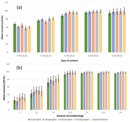 After morphological and structural characterisation, the samples were used as sorbents, and their performance was evaluated in order to determine whether they could be applied for the removal of contaminants and analytical purposes. Standard solutions containing NSAIDs at different concentrations (0.1, 1.0, and 7.5 µg/mL, respectively) were used to investigate the recovery response. The results regarding the type of sorbents (Figure 6a) showed that there was an increase in the adsorption capabilities of the sorbent by increasing the carbon content (from CFe12 to CFe41). However, the sorbent with the highest carbon content (CFe81) had an adsorption capacity slightly lower than that of the CFe41, and also the precision of the method was definitely inferior. This lowering in precision is likely due to the decrease in the separative capacity of the sorbent from the solution containing the analytes when an external magnetic field is applied. According to the results of previous characterisations, the CFe81 sample appeared to possess a lower crystallinity; some preliminary considerations deriving from this observation could suggest that, below a certain crystallinity threshold, there might be some influence of carbon crystallinity on the capability as adsorbent due to a different surface area and porosity.
