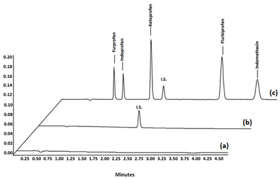 UHPLC chromatograms of samples subjected to the proposed MSPE method: (a) blank plasma samples; (b) blank plasma samples spiked with internal standard; (c) blank plasma spiked with I.S. and the investigated NSAIDs.