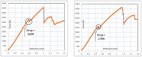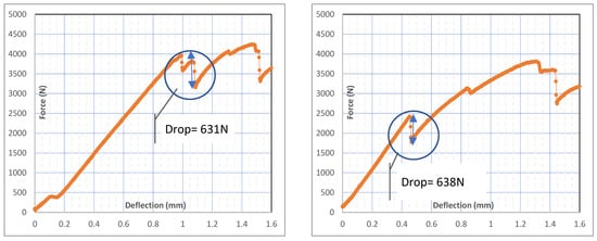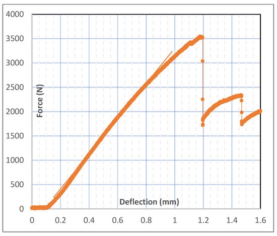 Figure 2 shows an example of force–deflection diagrams in lab conditions. All force–deflection graphs show a trend similar to that in Figure 2: The force–deflection curve has an almost linear behaviour before it reaches the diagram’s climax, where the first drop/kink happens. This behaviour repeats a few times until the end of the tests. In all graphs, the maximum force is associated with the first peak. After the first peak, the force at the subsequent peaks is less than or equal to the force at the first peak. After each drop, some strength is recovered until the next drop happens. Each drop in the graph could be associated with a failure in the material caused by a local defect. Defects cause stress concentration and initiate the shear crack/failure.