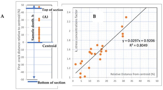 (A) Absolute distance of first cracks in specimens relative to section centroid. (B) Stress concentration as in Equation (1).