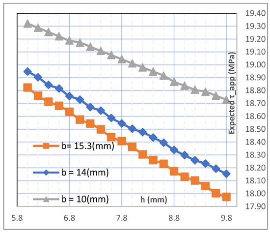 Equation (6) suggests that the size of BC members would influence their shear capacity. This is illustrated in Figure 6. This figure presents predictions of the probabilistic model for samples with thicknesses between 5 mm and 10 mm and widths between 10 mm and 15.3 mm based on the test results. Figure 6 shows that expected varies by sample thickness (h) and width (b). Dependence of apparent strength on member size should be considered in structural design with BC. Moreover, Figure 6 shows that apparent strength is higher for thinner elements.