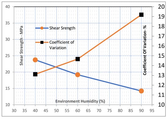 Shear tests on BC samples with different moisture contents and in equilibrium conditions showed that moisture reduced the shear capacity of BC. The change in shear capacity with humidity is shown in Figure 7. This figure shows the shear strength of samples due to 40%, 60%, and 90% humidity for 21 exposure days. Considering the sample size, which was 50 mm × 15 mm × 8 mm, it was assumed that after 21 days of exposure, the samples were in moisture equilibrium conditions with the environmental chambers. Five specimens were tested at each humidity level, and shear tests were carried out according to ASTM D2344. The coefficient of variation of shear capacity data points increased with moisture (Figure 7). This could be attributed to the activation of more imperfect sites by moisture, increasing the randomness of shear failure in samples.