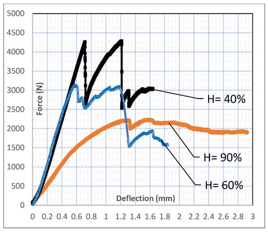 Three-point shear test force–deflection diagrams under different environmental humidity conditions—exposure time = 21 Days.