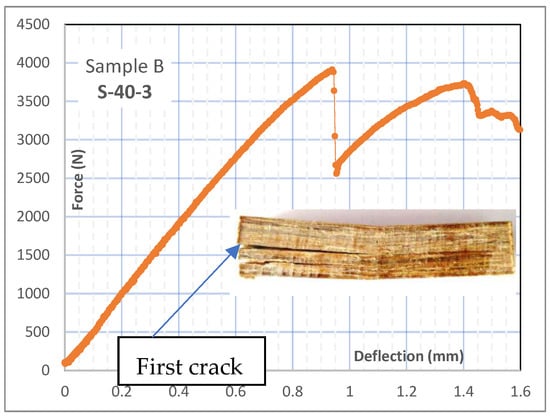 In equilibrium moisture conditions and when specimens were not exposed to humidity change, minor kinks (local failure) in 29 samples out of 30 specimens did not happen before the first crack. This can be seen in Figure 2. However, when the humidity conditions of samples were changed, a different trend in local failure was seen (see Figure 8 and Figure 9). Force–deflection diagrams in Figure 8 and Figure 9 are ascending after the first kink, which suggests that local failures (highlighted by circles in Figure 8 and Figure 9) happened before reaching the shear capacity of the section. The force drop due to local failure was considerable, as seen in Figure 8, and exceeded 630 N, suggesting that a large matrix area ruptured. The force drop due to local failure was lower in samples exposed to the same conditions (T = 20 °C and H = 40%) for seven days (Figure 9). As shown in Figure 9, the force drop in these samples was lower than 180 N. Samples kept in T = 20 °C and H = 40% conditions for 3 and 7 days are called S-20-40-3 and S-20-40-7, respectively.