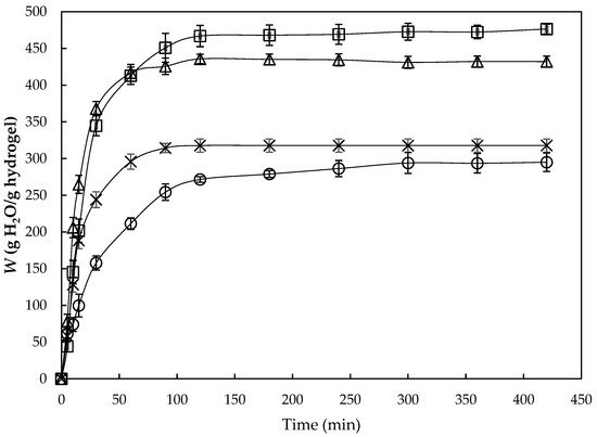 - Jayaramudu, T.; Ko, H.-U.; Kim, H.C.; Kim, J.W.; Kim, J. Swelling behavior of polyacrylamide–cellulose nanocrystal hydrogels: Swelling kinetics, temperature, and pH effects. Materials 2019, 12, 2080. [Google Scholar] [CrossRef] [PubMed]