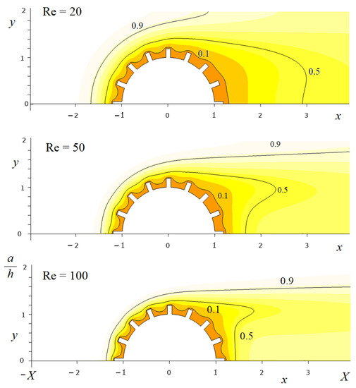 Distribution of the dimensionless concentration of the point particles in the transverse flow past a row of parallel profiled fibers with protrusions for different Reynolds numbers; the concentration values are marked on the curves; Sc = 1; a/h = 0.5; flow direction from left to right.