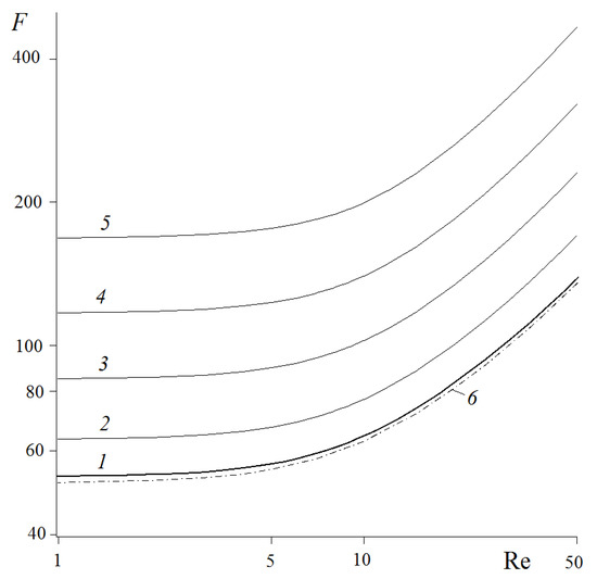 Dimensionless drag forces per unit length of profiled fibers with parallel rectangular protrusion obstacles (curves 2–5) with a protrusion thickness of 0.1 and a protrusion height of 0.1 (2), 0.2 (3), 0.3 (4), 0.4 (5), solid curve 1—smooth fiber; dashed-dotted curve 6—a fiber with parallel grooves with width and depth equal to 0.1 and 0.4; a/h = 0.5.