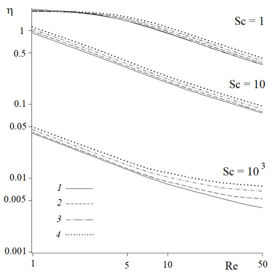 Retention efficiencies for a profiled fiber with protrusion obstacles vs. Reynolds number at different values of the Schmidt number (given in the Figure); the thickness of the protrusion is 0.1 and the heights of the protrusions are 0.1 (1), 0.2 (2), 0.3 (3), 0.4 (4); a/h = 0.5.