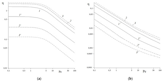 Retention efficiencies for fibers with profiling (with protrusions of rectangular cross section) vs. Peclet number at = 1 (a), 1000 (b): (curves 1–3)—deposition on external protrusions, (1’–3’)—deposition on the part of the fiber surface of radius . Calculations for different protrusion heights 0.1 (1, 1’), 0.2 (2, 2’), 0.3 (3, 3’).