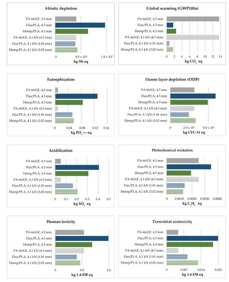 Although the origin of the raw materials of the PA66/GF composite on the market are fossil resources, due to the mechanical properties of the material and the composite production technology, it shows the lowest environmental impact among other composites in several impact categories (eutrophication, acidification, terrestrial ecotoxicity, and abiotic depletion). The composite of this composition has an expressed superiority of the lowest impacts on eutrophication and acidification, the other thinner variations of the analogous composites fall three to four times behind in their impacts. In LCA calculation, La Rosa has compared a glass fiber and hemp fiber carpet and the first one has higher impact in all categories, except in occupation of land area [24]. Our study demonstrates the impact of PLA fiber on composites containing plant fibers, which increases the total environmental impact of the composites, but still the impact of these composites on global warming potential is several times lower than from the PA66/GF composite.