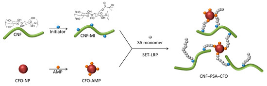 A schematic representation for developing the CNF–PSA–CFO material network is shown in Figure 1. Surface-modified CFO (CFO-AMP) particles were combined with the CNF macroinitiator (CNF-MI) in presence of SA monomer to conduct a SET-LRP reaction to realize the multifunctional CNF–PSA–CFO network. Modified CFO act not only as a crosslinking agent but also gives bi-functional—magnetic and electrochemical—properties to the CNF–PSA–CFO network. On the other hand, poly-stearyl acrylate (PSA) introduces a strong hydrophobicity to the network, which helps to develop gel ink for gel 3D printing.