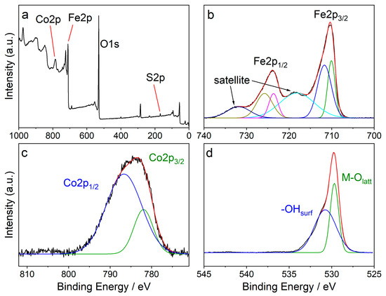 Figure 2a shows the full XPS survey of CFO-AMP. It reveals that the sample consists of cobalt (Co), iron Fe, and oxygen O as well as sulfur S. The high-resolution XPS spectra of Fe2p, Co2p, and O1s are shown in Figure 2 b–d, respectively. In the deconvoluted Fe2p spectrum (Figure 2b), six signals were observed at 710.1, 711.7, 718.1, 723.7, 725.8, and 731.9 eV with the complex multiplet splitting of iron oxides [65,66]. The Co2p high-resolution XPS spectra can be deconvoluted into two peaks at 782.0 eV and 786.7 eV. The O1s peaks at 529.7 and 530.7 eV were assigned to lattice oxygen and surface-adsorbed oxygen, respectively.