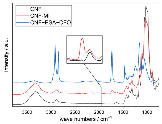 FTIR spectra of pristine CNF, CNF-based macroinitiator (CNF-MI), and poly(SA)-grafted CNF (CNF–PSA–CFO). Data were shifted in intensity by equal amounts for better visualization.