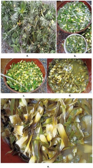 Pineapple crown leaf fibers (PCLF) from the Queen variety grown in India, were extracted using water in a mechanical retting process. Initially, each pineapple fruit was peeled from the cluster of crown leaves (Figure 1a). These leaves were then put into a large basin, which was subsequently filled with fresh water until the leaves were completely submerged, as shown in Figure 1b. Following this, the top of the basin was completely covered with a metal sheet in order to exclude direct sunlight and rain. The basin was opened every five days (Figure 1c) and the water was replaced. The total duration of the retting process was 20 days, in order to simulate, as closely as possible, the type of field retting performed on more diffuse fibers such as hemp [33] (Figure 1d). At the end, the water was removed (Figure 1e).