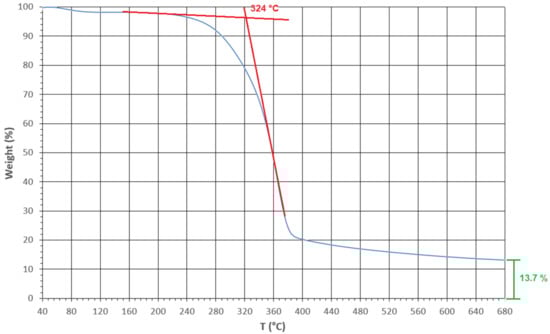 Thermogravimetric analysis (TGA) was used for the measurement of the thermal stability and temperature degradation intervals of the fibers using a temperature scanning procedure. An STA 449 F3 Jupiter (NETZSCH GmbH & Co. Holding KG, Selb, Germany) instrument was used for analysis, which was able to accurately record the sample weight during heating between ambient temperature and 1550 °C. Approximately 5.3 mg of PCLF was heated in an aluminum oxide (Al2O3) crucible; and the temperature was increased from 40 to 700 °C at 10 °C per minute. Nitrogen (N2) was delivered to the heating system at a flow rate of 30 mL/min to preserve an inert environment.