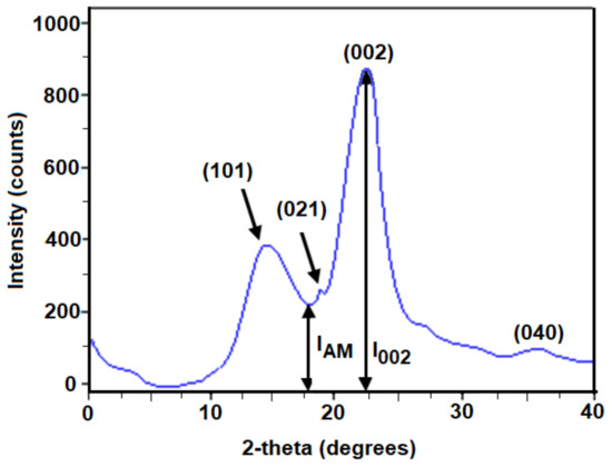 The X-ray diffraction results allowed the calculation of the crystallinity index (CI) of the fibers, using the peak height method, as suggested in [51]. The peaks obtained, after baseline correction, corresponded to the different forms of crystalline native cellulose I, as is also normally the case in PALF, as thoroughly investigated for 12 cultivars in [52]. The measured peaks (Figure 5) indicated four crystalline reflections with relevant maxima, namely (101) at 14.8°, (021) at 19.7°, (002) at 22.4°, and (040) at 35.8°. The crystallinity index was calculated according to Equation (1), based on the intensity of the (002) peak I002 and of the low intensity peak Iam, corresponding to the amorphous cellulose fraction and localized at 17.7°, as first proposed in [53]: