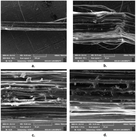 Scanning electron microscopy (SEM) observations produced evidence that the untreated PCLF are not particularly prone to fibrillation when unloaded, as shown in Figure 6a. Further study at a higher magnification also provided evidence that, especially in the midrib areas, the fibrils can be folded at angles and twisted with different orientations (Figure 6b). It is noteworthy that pineapple leaves develop a midrib only at the later stages of their growth [60]. It is therefore likely that this fibril folding phenomenon would arise only once the crown is removed from the fully ripe fruit. On the other hand, retting did not allow complete degumming, as suggested by Figure 6c,d; the latter image also offers some indication of the rather repeatable and uniform diameter along the length of the fibrils. This is not the case for PALF, where variation in the diameter of the retted fibers up to a factor of 3 was measured on a sample of 120 fibers [61]. A more thorough investigation into the variability in diameter for PCLF will be the subject of further study.