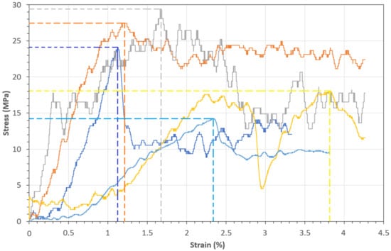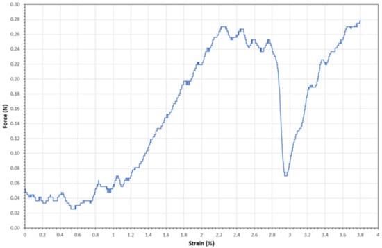 Finally, tensile testing on the fibers offered a maximum load of 0.28 (±0.15) N, which, when considering the diameter as constant along the fiber, offered a maximum strength equal to 24.3 (±8.4) MPa, with a corresponding ultimate strain equal to 2.19 (±1.06)%. It proved difficult to apply the load, as illustrated in Figure 8, with the frequent load drops likely to have been due to torquing of the fibrils during loading, leading to their mutual detachment. This can possibly be attributed to the complex alignment of the fiber in the direction of the clamps which was due to a considerable fineness (in the order of 10 microns) of the fibrils arising during loading, despite the fact that their cohesion appeared to be sufficient before applying the force. The values for the tensile stress were obtained by considering the fiber as circular with constant diameter and are equal to the values measured at five locations along it, which might have led to a degree of imprecision. Out of the 20 fibers tested, five of the curves are reported in Figure 9. These were considered to be the most reliable results, in view of the aforementioned difficulties in acquiring the stress and strain information. In Table 5, the data measured for PCLF are compared with the tensile strength and ultimate strain of the other leaf-extracted fibers.