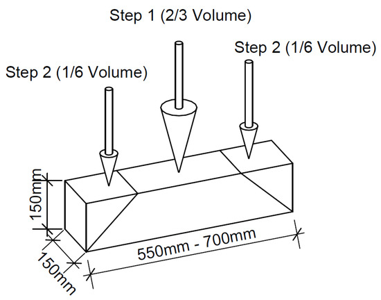 Preparation of samples according to standard EN 14651, the casting is performed in two steps, arrows denote filling areas.