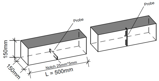 A sketch showing the location of the notch for the bending test in relation to the filling side and the location of the fiber orientation probes, probe 1 is located for use with the casting bottom as notched surface (left picture), and probe 2 is located for use with a side wall as notched surface (right picture). The darker surface of the sample beam indicates the filling side during the casting.