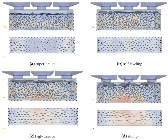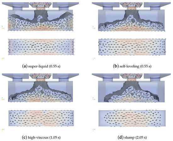 An intermediate state of the filling of the formwork can be seen in Figure 4; the screenshots are taken at different time steps for different flowabilities to show differences in flow behavior.