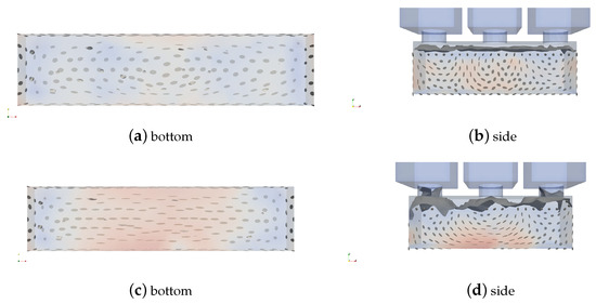 Looking at the plots in Table 3 of the numerical simulations for the self-leveling case, one can notice some patterns in the distribution of glyphs emerging. The alignment glyphs in the side view start to follow a circle around the inflow point. For the center casting, this means the fibers are starting to have a tendency to be aligned along the beam axis in the bottom layer, but the director turns upwards with increasing distance from the center. The same tendency of the director turning upwards can be observed for the side casting, though it is less pronounced here. In the case of the normative casting, there are regions between the three casting points where the director is pointed upwards.