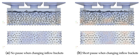 In the normative filling process, concrete cones with a clear valley between the cone tips can be seen even during the second filling step. The concrete surface does not level out completely. Complete displacement of the air bubbles cannot be seen. In the case of one-sided filling, the slope on the concrete surface remains even after the container has been completely emptied. Figure 4d demonstrates the behavior of the slump mixture. As we can notice, the mixture is so highly viscous that even at the time step 2.05 s the mixture has a strong cone shape and it flows so slowly that it did not reach the sidewalls of the formwork.
