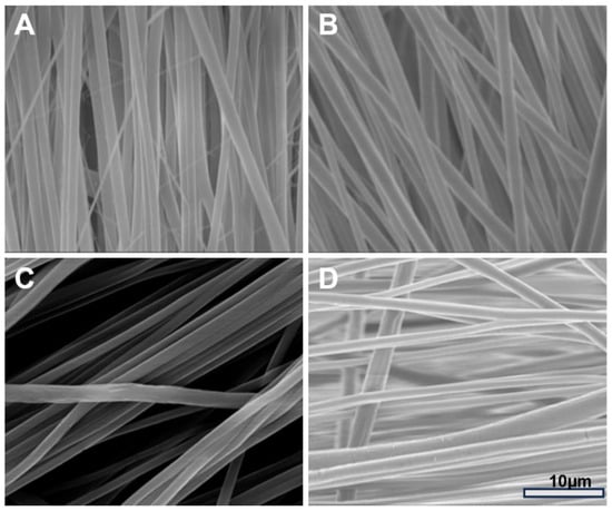 Surface morphology of the PPG fibrous scaffold. (A–D) represent SEM images of as prepared electrospun fibers of PPG-0, PPG-20, PPG-35, and PPG-50, respectively.