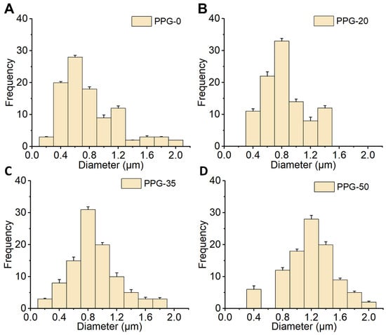 Size distribution of PPG fibrous scaffold. Histograms, (A–D) represent the distribution of fiber diameters of the as-prepared PPG-0, 20, 35, and 50 samples, respectively.