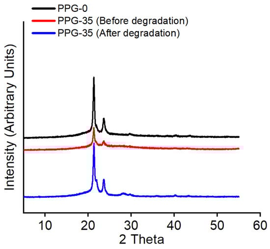 The intensity and position of these peaks can be used to determine the degree of crystallinity in the sample. The XRD pattern for the PGC nanofiber scaffold showed two major peaks, 2θ = 21.7° and 2θ = 23.9°, which correspond to the (110) and (200) crystal planes of PCL, respectively (Figure 3). This indicates that there is no significant change in the chemical structure of PPG fiber even with the addition of PGC. Both PCL and PGC polymers are physically mixed in the fibers. However, the PCL peaks seem enhanced in the PPG-35 samples after its degradation. This indicates the degradation might have happened in the PGC potion and left the PCL crystalline phase enhanced.