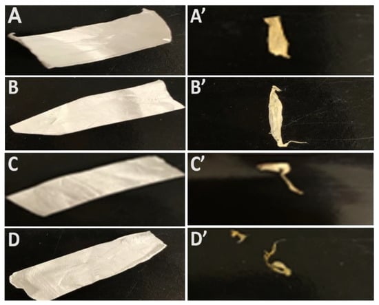 Gross appearance of PPG nanofiber scaffolds in vitro degradation. Camera images of the scaffolds PPG-0 to PPG-50 before degradation (A–D) and after four weeks degradation (A’–D’).