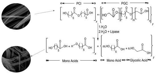 After one month, the fiber containing an equal composition of both polymers was almost completely degraded in the Amano lipase solution. Though PCL is known to degrade slowly, the initial degradation of PCL started out quickly in Amano lipase. The degradation mechanism of the combined PCL and PGC through hydrolysis is attributed to the cleavage of ester bonds, as illustrated in Figure 6. Additionally, the lipase enzyme, represented in the same figure, acts as a catalyzing enzyme to fragment the long polymer chain into smaller polymer fragments that are water soluble [47]. Overall, the degradation time can help to determine the suitable area of application.