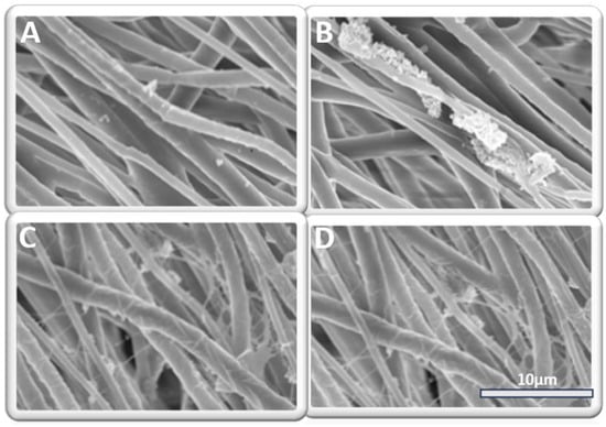Surface modification of PPG fibers. (A,B) represents SEM images of PDA-coated PPG fibers. (C,D) represents the SEM images of PDA–collagen-coated PPG fibers.