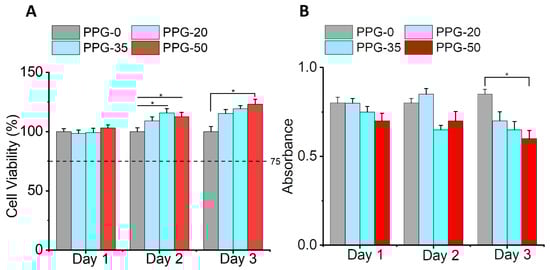 NIH-3T3 mouse fibroblast cell lines were obtained from the American Tissue Type Culture Collection (ATCC 1658, Manassas, VA, USA), and the cells were cultured in a 75 cm2 culture flask and maintained in a tissue culture incubator at 37 °C and 5% CO2 atmosphere. After reaching about 80% confluency, the cells were detached and seeded to the PPG meshes. Before seeding the cells, the nanofiber sample pieces (n = 3), were circularly cut, and attached to a 24-well plate with Kwik-SilTM Surgical Silicone Adhesive (World Precision Instruments LLC, Sarasota, FL, USA). Each sample was sterilized using ethanol under UV. A 100 µL aliquot of medium mix containing about 50,000 cells was seeded on the different samples and grown in a humidified incubator (37 °C, 5% CO2) for days 1, 2, and 3.