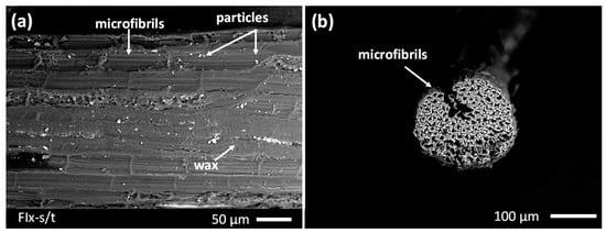 SEM micrograph of untreated Fix: (a) longitudinal section; and (b) cross section.