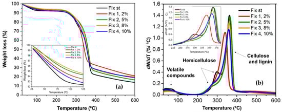 The thermal stability of treated and untreated fibers was investigated through thermogravimetric analysis. TGA curves and their derivatives (DTGA) were plotted against temperature. Figure 4a,b depict, respectively, the TGA graphs and DTGA curves of FIx treated at 25 °C with varying NaOH concentrations. In general, it was observed that between 25 °C and 125 °C, all fibers experience a slight weight loss attributed to wax and moisture removal. As the NaOH concentration used in the alkaline treatment increases, a reduction in the moisture content of the treated FIx is evident. This distinction becomes clearer in the DTGA curves, which exhibit a decrease in hemicellulose content—an element of the fiber that absorbs most of the moisture. Notably, the moisture content is linked to capillary water, making complete elimination challenging due to its hydrophilic nature [17,60,61]. Within the range of 200 °C to 317 °C, a weight loss occurs corresponding to hemicellulose decomposition (which, being amorphous, exhibits lower thermal stability than cellulose). This is more distinctly evident in the DTGA curve. Subsequently, the weight loss between 317 °C and 390 °C would correspond to cellulose decomposition. On the other hand, lignin decomposition has been reported to occur within the range of 400 °C to 500 °C [33]. The residue corresponding to 17% by weight at a temperature of 600 °C is attributed to the presence of minerals (Ca, K, Si, Mg, Al, S, and Fe, among others) [15,62,63,64].