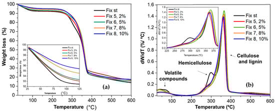 Figure 5a,b, respectively, illustrate the TGA and DTGA graphs of FIx treated at 65 °C with varying NaOH concentrations. A trend towards lower moisture and hemicellulose content is discernible with the increase in NaOH concentration. In fact, in the fiber treated with 8% NaOH, the hemicellulose peak is nearly absent, possibly indicating near-complete removal of hemicellulose from the fiber [17]. In the temperature range around 400 °C, a convolution of different degradation mechanisms is observed, complicating the estimation of cellulose and lignin content through this type of analysis [65]. Nevertheless, TGA analysis provides insights into conditions of alkaline treatment conducive to the removal of significant amounts of moisture, waxes, and hemicellulose—components of lower thermal stability that can hinder the processing of composites with such fibers via melt blending. Additionally, this analysis enables us to define potential formulations for PC, as these fibers could be employed with various polymeric matrices processed within the temperature range of 160 °C to 250 °C, such as LLDPE, PP, PBT, and PA6, among others.